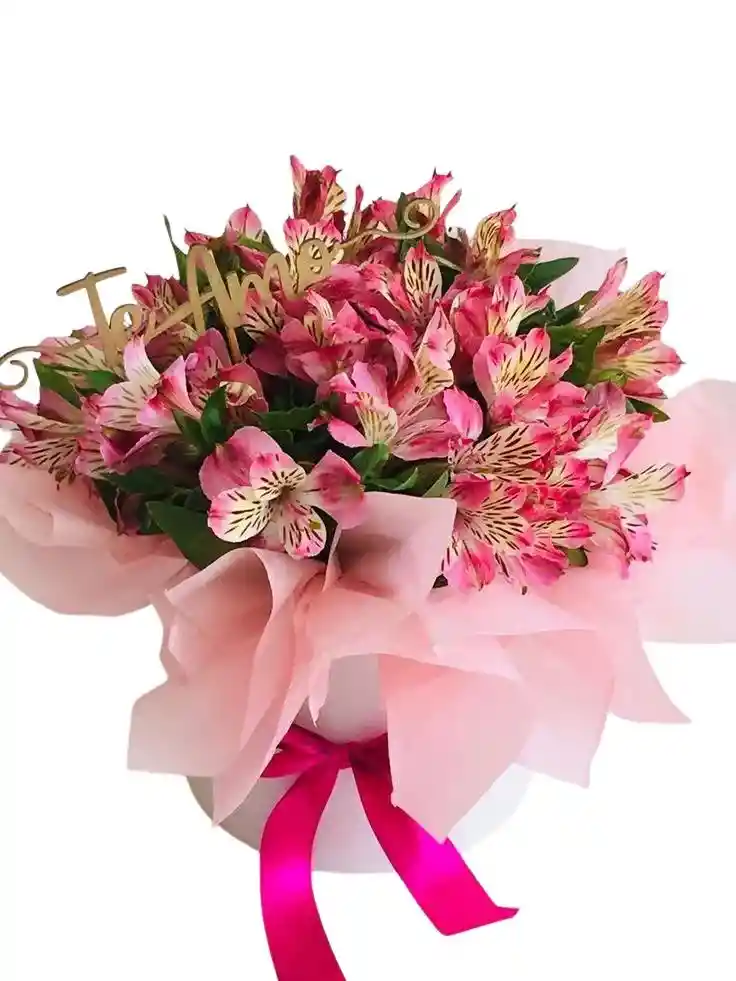 Caja de 2 paquetes de astromelia rosada Nota: La flor puede ser sustituida dependiendo la disponibilidad de color y del producto “Mensaje Personalizado” máximo de 30 caracteres (Dejar el mensaje en el chat, los comentarios no se previsualizan para la tienda por lo que si se dejan allí no podrá ser incluido).
