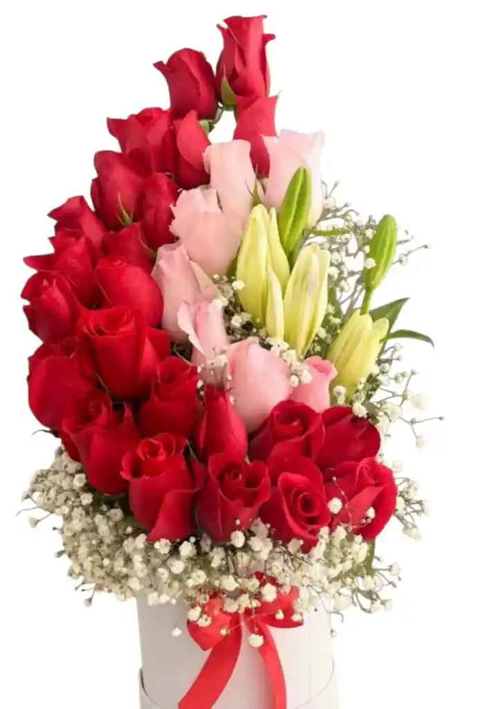 Hermosa caja de rosas de colores combinados rojo y rosados adornada con lirios y gisofilias, Lleva lazo cinta