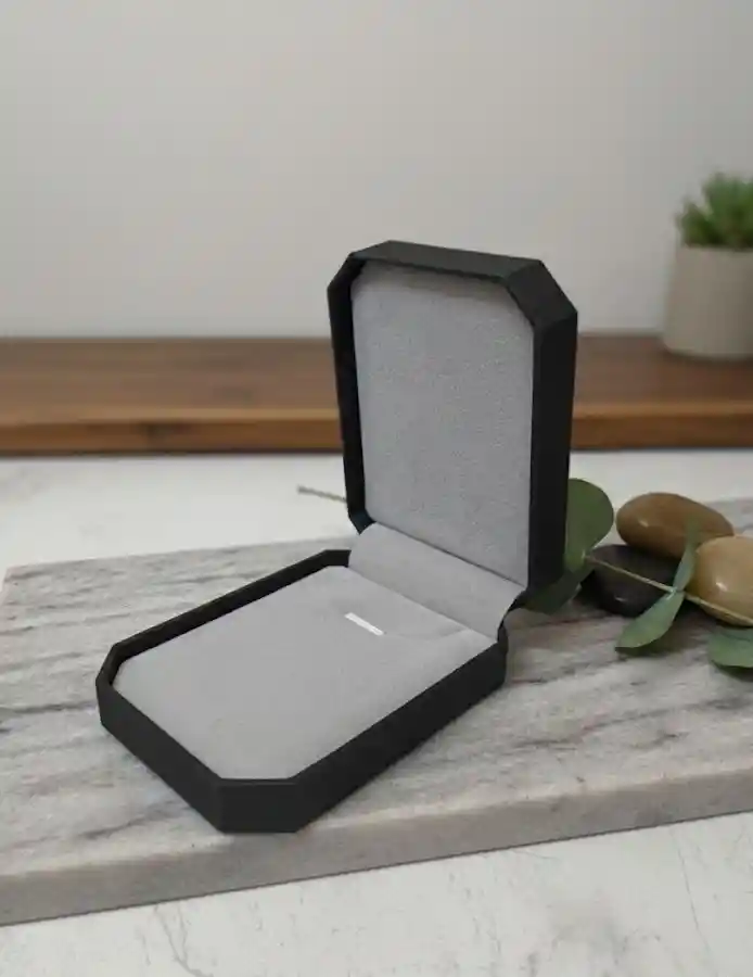 Caja estuche negra hexagonal de lujo, ideal para presentar joyas de manera moderna y sofisticada. Su diseño ge...Ver más