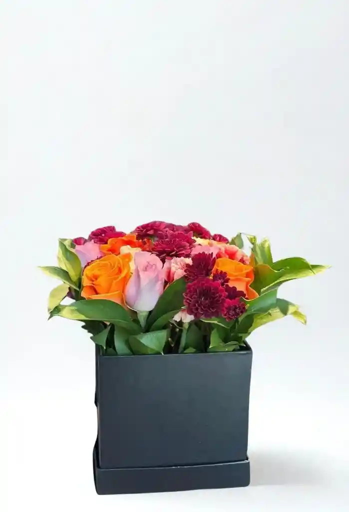 Caja cuadrada negra con aprox. 6 rosas naranjas, 6 rosas rosadas, 1 paquete de dalia roja , 6 varas de aspidistra y 6 varas de rusco . Nota: La flor puede ser sustituida dependiendo la disponibilidad de color y del producto “Mensaje Personalizado” máximo de 30 caracteres (Dejar el mensaje en el chat, los comentarios no se previsualizan para la tienda por lo que si se dejan allí no podrá ser incluido).