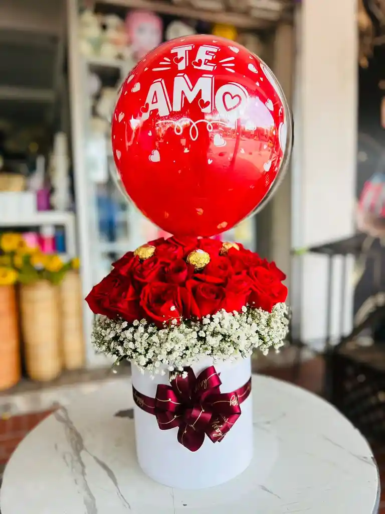 CAJA FLORAL DE ROSAS Y CHOCOLATES X3 INCLUYE UN GLOBO (EL GLOBO QUE ACOMPAÑARA EL DISEÑO SERA DE FELIZ DIA EN CASO DE QUE EL CLIENTE NO NOS INDIQUE LA OCASION )