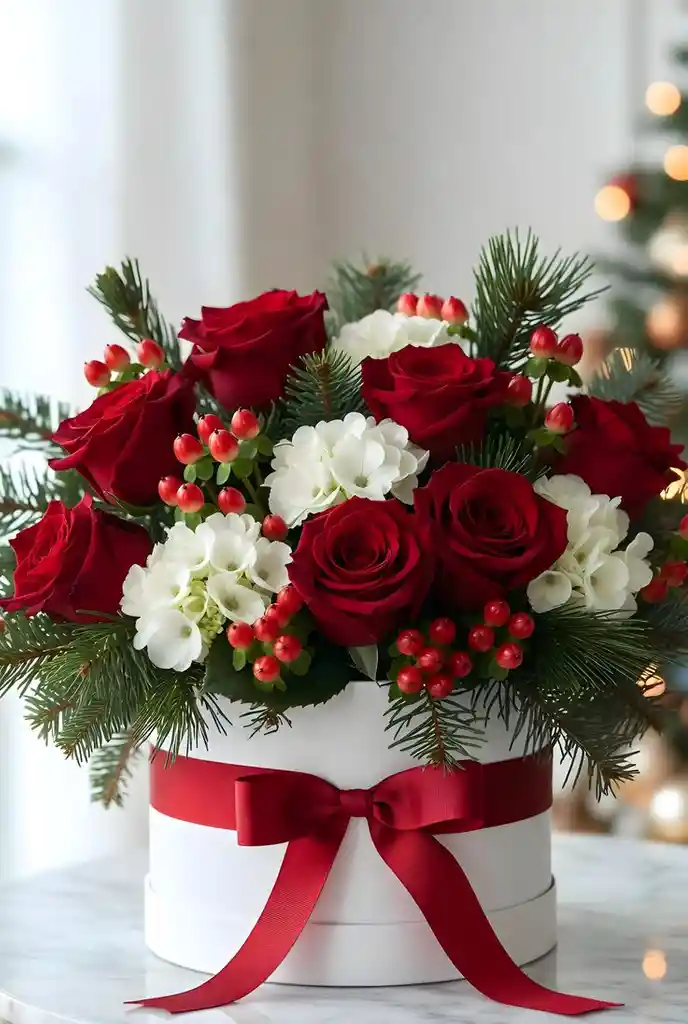 Un arreglo navideño de lujo que combina rosas rojas intensas, flores blancas de textura suave y racimos de berries rojos sobre una base de follaje de pino fresco. Presentado en una caja cilíndrica blanca con listón rojo satinado, este diseño aporta un equilibrio perfecto entre tradición, frescura y elegancia decembrina. Ideal para decorar salas, oficinas, recepciones o para regalar un detalle inolvidable lleno de armonía y espíritu festivo. Su mezcla de tonos rubí, nieve y verde profundo transmite calidez, celebración y la esencia más auténtica de la Navidad.
