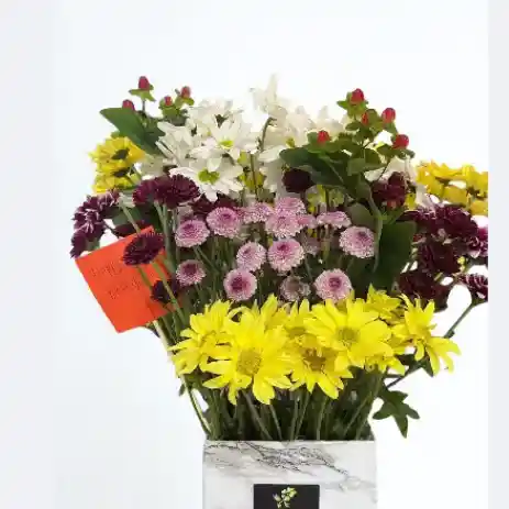Caja mix con 5 varas de margarita amarilla, 4 varas de pompones morados , 3 varas de margarita amarilla, 7 varas de margarita vinotinto y 5 varas de rusco Nota: La flor puede ser sustituida dependiendo la disponibilidad de color y del producto “Mensaje Personalizado” máximo de 30 caracteres (Dejar el mensaje en el chat, los comentarios no se previsualizan para la tienda por lo que si se dejan allí no podrá ser incluido).