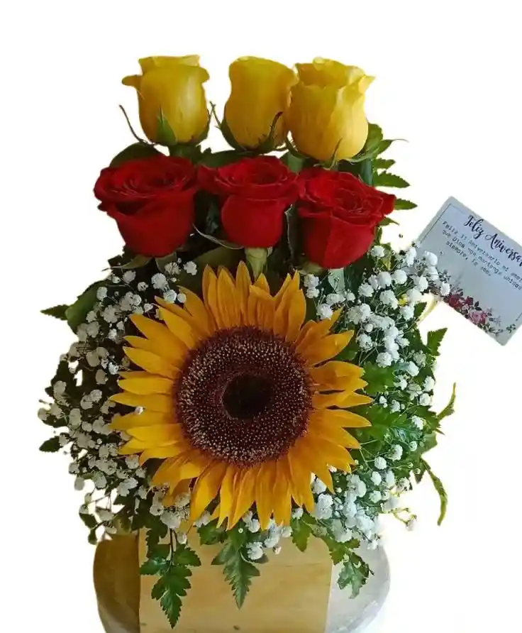 Caja pequeña de 1 girasol y 3 rosas rosas y 3 rosas amarillas con gypsophila Nota: La flor puede ser sustituida dependiendo la disponibilidad de color y del producto “Mensaje Personalizado” máximo de 30 caracteres (Dejar el mensaje en el chat, los comentarios no se previsualizan para la tienda por lo que si se dejan allí no podrá ser incluido).