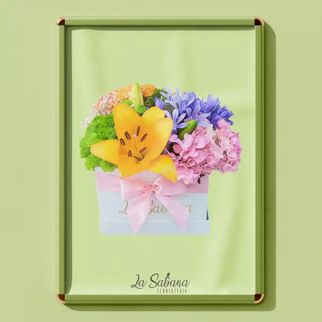 Caja de flores compuesta por lirio, gerbera, hortensia, rosas y hermosos follajes silvestres.