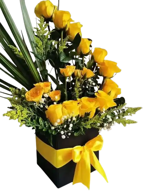 Caja cuadrada en forma de cascada de rosas amarillas (aproximadamente 12 rosas). La flor puede ser sustituida dependiendo la disponibilidad de color y del producto “Mensaje Personalizado” máximo de 30 caracteres (Dejar el mensaje en el chat, los comentarios no se previsualizan para la tienda por lo que si se dejan allí no podrá ser incluido).
