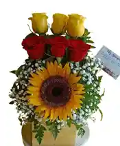 Caja pequeña de 1 girasol y 3 rosas rosas y 3 rosas amarillas con gypsophila Nota: La flor puede ser sustituida dependiendo la disponibilidad de color y del producto “Mensaje Personalizado” máximo de 30 caracteres (Dejar el mensaje en el chat, los comentarios no se previsualizan para la tienda por lo que si se dejan allí no podrá ser incluido).