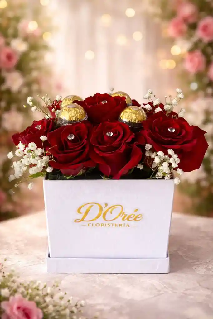 Sorprende con este elegante y delicado arreglo floral, perfecto para expresar amor, admiración o hacer un detalle inolvidable. Este hermoso diseño incluye: 🌹 12 rosas rojas frescas de alta calidad 💎 Perlas tipo diamante que aportan un toque sofisticado y brillante 🌿 Follaje blanco decorativo que resalta la elegancia del arreglo 🍫 4 chocolates Ferrero Rocher, ideales para complementar este regalo especial Presentado en una fina caja blanca, este arreglo combina romanticismo y dulzura en un solo detalle, perfecto para cumpleaños, aniversarios o cualquier ocasión especial. 💝 💌 Un detalle que enamora a primera vista y conquista el corazón. 💌 El diseño y estilo de la caja puede variar según disponibilidad, manteniendo siempre la misma elegancia y calidad del producto.