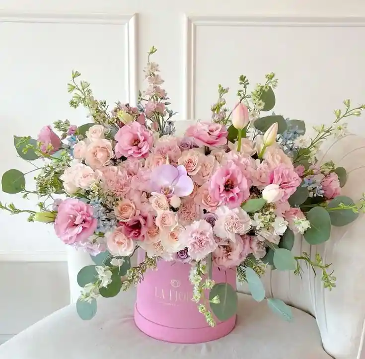 Arreglo floral en caja rosa con una combinación premium de lisianthus, rosas en tonos pastel, tulipanes, claveles, orquídea phalaenopsis y follaje de eucalipto. Diseño abundante, delicado y de alta calidad, ideal para ocasiones especiales como cumpleaños, aniversarios, maternidades o regalos significativos. Las flores son seleccionadas por su frescura y armonía de colores, creando un acabado elegante y sofisticado. Incluye lazo decorativo y tarjeta personalizada.