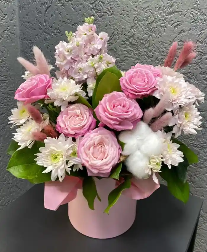 Caja redonda en tonos pastel con rosas , margaritas , follajes frescos y detalles suaves . Una pieza tierna, elegante y perfecta para iluminar cualquier celebración.