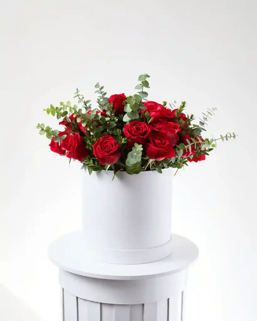 Elegante box de 24 rosas rojas seleccionadas y follaje fresco. Incluye tarjeta de dedicatoria