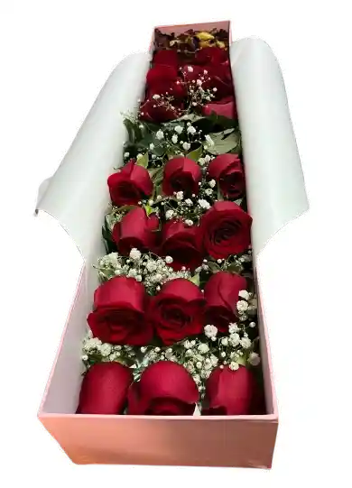 Caja elegante con rosas rojas frescas, pétalos y flores secas aromáticas. Un detalle romántico y original para aniversarios, propuestas o San Valentín. Presentación premium en caja decorativa e incluye tarjeta dedicatoria. Entrega rápida el mismo día.