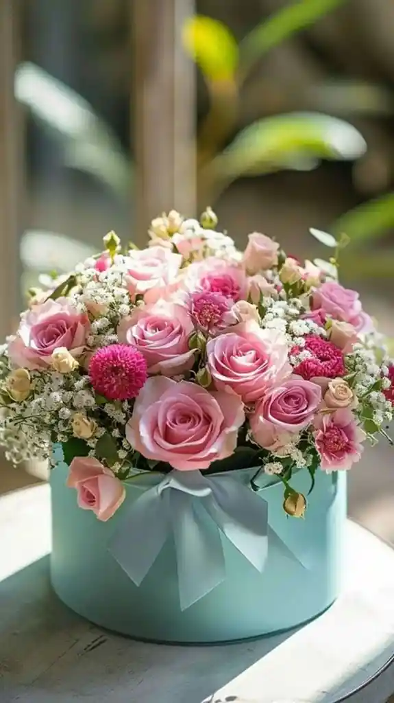 Un suspiro en tonos rosados, con rosas, pompones y gypso. Un detalle suave y encantador que habla desde el corazón.