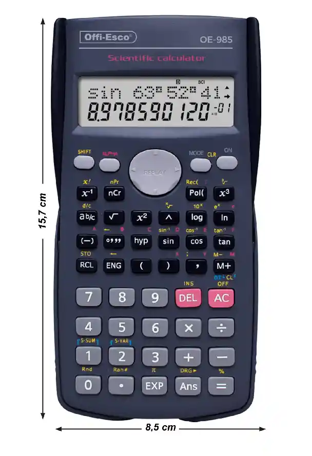 Calculadora Científica Offi-Esco OE-985. Pantalla de 2 lineas, 240 funciones, calculo y conversion de fracciones, conversion de coordenadas, reproduccion de varias lineas, computacion estadistica, generacion de numeros aleatorio, Memoria de respuesta final (ANS9. Ideal para el colegio, la univeridad y el trabajo.