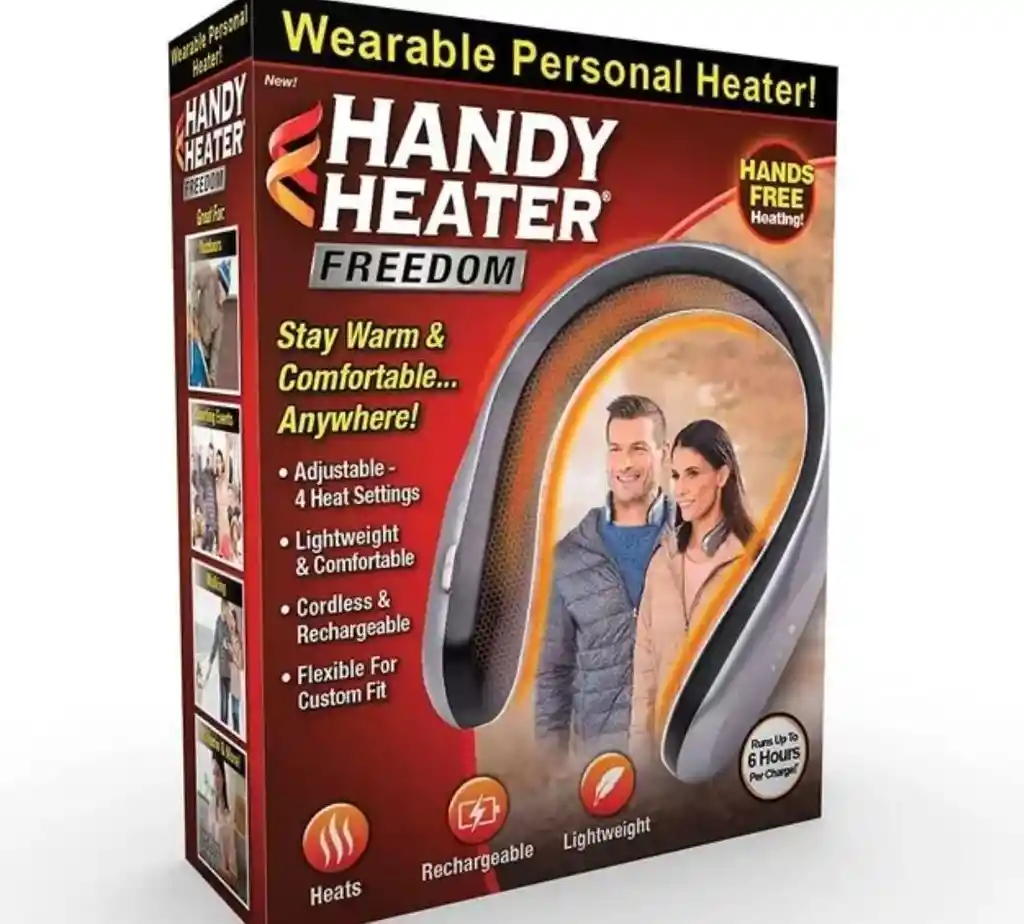 Calentador de cuello portátil único Combate el frío invernal como un profesional con el calentador Ontel Handy, un calentador de cuello portátil que calienta el cuello y el hombro, e irradia calor por todo el cuerpo, manteniéndote caliente y tostado durante todo el día Calefacción personalizada Con tecnología Comfort-Heat y 4 configuraciones de calor, este pequeño calentador le permite personalizar el nivel de calor según sus requisitos de comodidad durante todo el día. Simplemente deslícelo alrededor de su cuello, enciéndalo y el frío se habrá ido Calentador que funciona con baterías este mini calentador liviano funciona con una batería recargable que contiene hasta 6 horas de carga el tiempo de ejecución depende de la configuración de velocidad, lo que lo convierte en un accesorio perfecto para llevar en los fríos días de invierno Calefacción manos libres El diseño inalámbrico y portátil de este calentador portátil mantiene las manos libres, por lo que es ideal para usar incluso en los días más fríos. Con una banda flexible para el cuello y un revestimiento suave al tacto, este calentador de batería se ajusta cómodamente a su cuello Llévalo a cualquier parte .