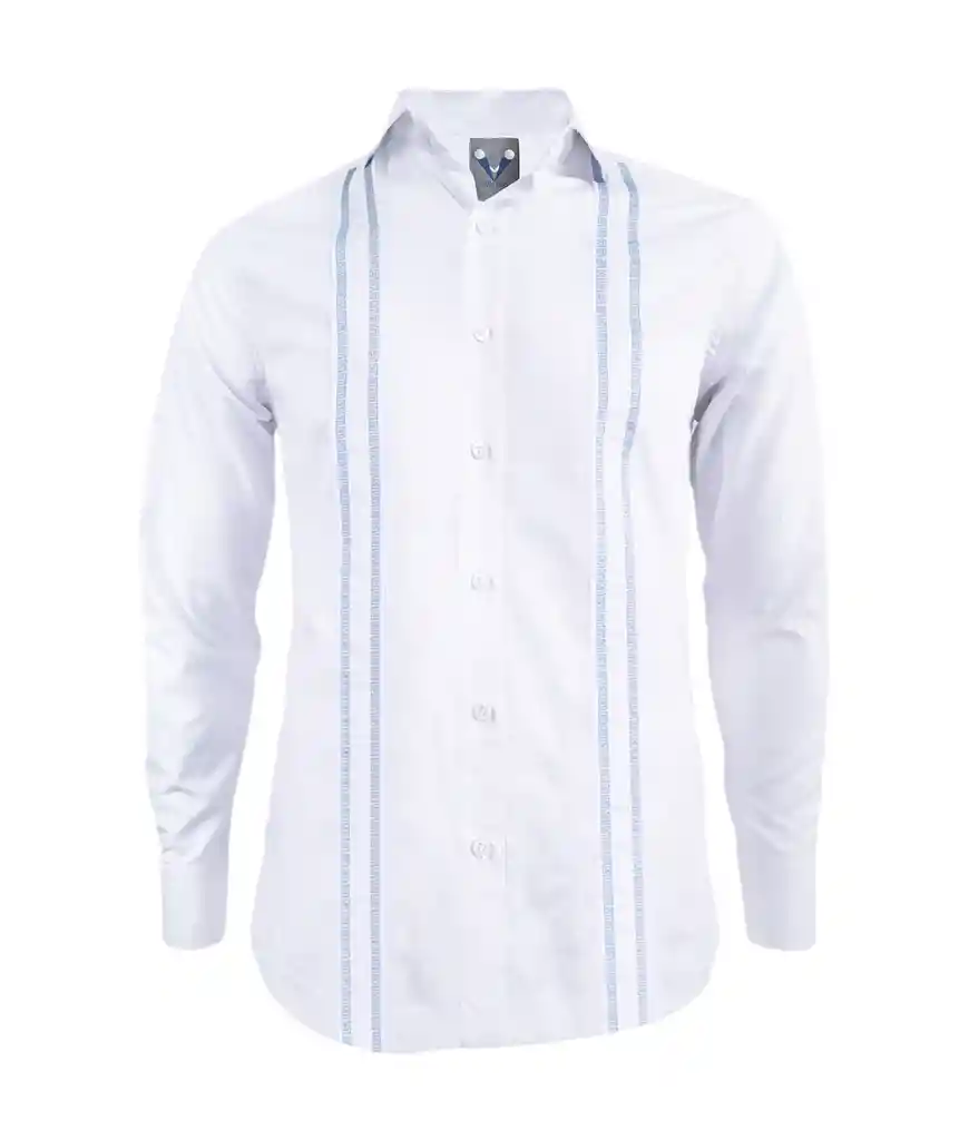Camisa guayabera en algodón para hombre de ocasión en blanco, bordada en la parte delantera con diseño de 4 líneas de bordado en forma de espiral en color azul claro, detalle de abertura lateral, sin bolsillos, manga larga. Fabricada en tallas estándar y también en tallas grandes. Detalles del Diseño: -Cuello: Francés -Silueta: Slim fit – Desde la talla (3XL) la silueta es Recta -Material: Algodón -Color: Blanco -Tipo de puño: En ángulo ¡Hecha en Colombia! En SON DOS fabricamos camisas personalizadas, desde la talla (XS) hasta la talla (10XL), para todas las ocasiones, para hombre y para mujer. ¡Fabricada exclusivamente para ti!