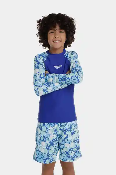 Protección Solar Kapua Floral Junior Masculino Para Niños de 6 a 14 Años Está Diseñada Con Los Más Altos Estándares Calidad Para Brindar Comodidad y Protección en el Agua y Bajo el Sol ya Que Cuenta Con Protección Upf 50 Que Brinda Protección uv (De Los Rayos Uvb y Uva) Una Camiseta Manga Larga Azul Con Logo Speedo en el Frente y Diseño Floral en Tonos Azules y Verdes en Las Mangas Que le Brindan un Diseño Único y Diferenciado Nuestra Camiseta de Protección Solar Puede Usarse Acompañado de la Pantaloneta Kapua Floral Junior Masculino Para Protegerlo de Los Rayos Del Sol.