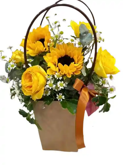 Una encantadora canasta con girasoles y rosas amarillas, perfecta para regalar alegría, luz y energía positiva. Flores frescas de calidad premium, seleccionadas y armadas profesionalmente para un diseño vibrante y armonioso. Algunas flores pueden variar según la disponibilidad de temporada, manteniendo siempre la estética y el valor del arreglo. Incluye tarjeta personalizada sin costo adicional.