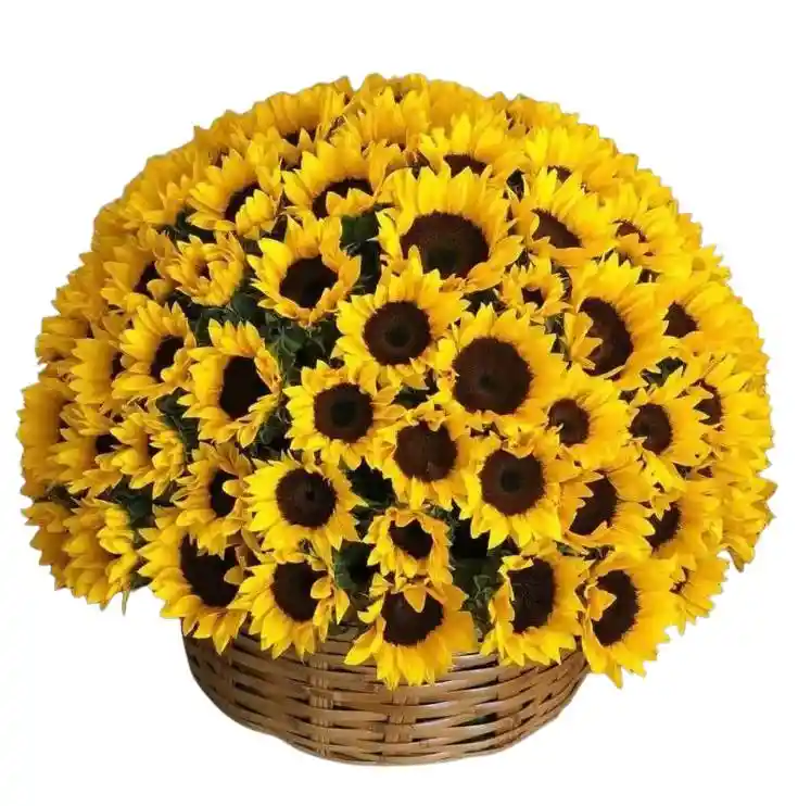 Canasta XL de 100 girasoles Nota: La flor puede ser sustituida dependiendo la disponibilidad de color y del producto “Mensaje Personalizado” máximo de 30 caracteres (Dejar el mensaje en el chat, los comentarios no se previsualizan para la tienda por lo que si se dejan allí no podrá ser incluido).