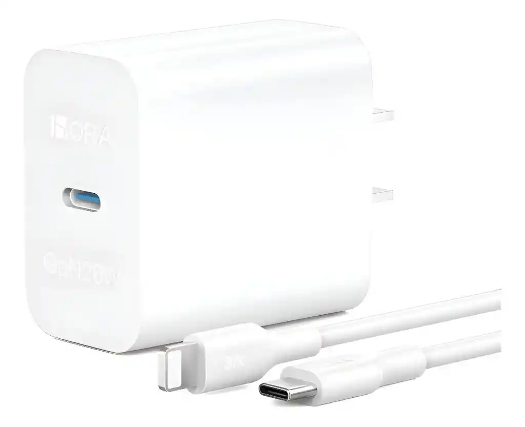 Cargador 20W de carga rápida para iPhone con cable de 8 pines incluido. Compatible con iPhone 11, 12, 13, X, XS y más. Diseño compacto color blanco, ideal para casa, oficina o viajes. Carga segura y eficiente.