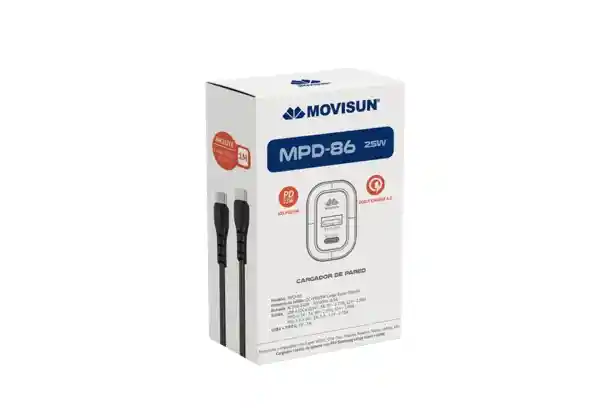 Cargador Movisun MPD-86 25W Carga Turbo 3.5A Qualcomm 4.0 El cargador Movisun MPD-86 es un dispositivo de nueva generación diseñado para ofrecer la máxima compatibilidad y velocidad. Gracias a la incorporación de la tecnología Qualcomm Quick Charge 4.0 y soporte para protocolos avanzados, es el aliado perfecto para mantener tus dispositivos cargados de forma segura y eficiente. Características Destacadas: Potencia de 25W: Ofrece una carga rápida ideal para smartphones modernos que demandan alta eficiencia. Tecnología Qualcomm 4.0: Protocolo de carga turbo que optimiza el tiempo de carga y gestiona mejor la temperatura. Protocolo VOOC: Compatibilidad especializada para dispositivos que requieren este estándar de carga rápida. Salida Dual Versátil: Equipado con 1 puerto USB y 1 puerto Tipo C, permitiendo el uso de diferentes tipos de cables según tu necesidad. Amperaje Potente: Entrega 3.5 Amperios, garantizando un flujo de energía constante y robusto. Protección y Calidad: Fabricado bajo estándares de Calidad Original, incluye múltiples sistemas de seguridad para proteger tu batería y dispositivo. ¿Qué incluye tu compra? 1 Adaptador de corriente Movisun MPD-86 25W. 1 Cable Tipo C a Tipo C de 1 metro de alta resistencia incluido en el empaque. Caja original sellada con garantía de fábrica. Por qué elegir el MPD-86: A diferencia de otros cargadores estándar, el MPD-86 destaca por su versatilidad. Al incluir soporte para iOS PD 30W y Protocolo VOOC, se convierte en una herramienta universal capaz de cargar desde un iPhone de última serie hasta equipos Android de alta gama con total seguridad.