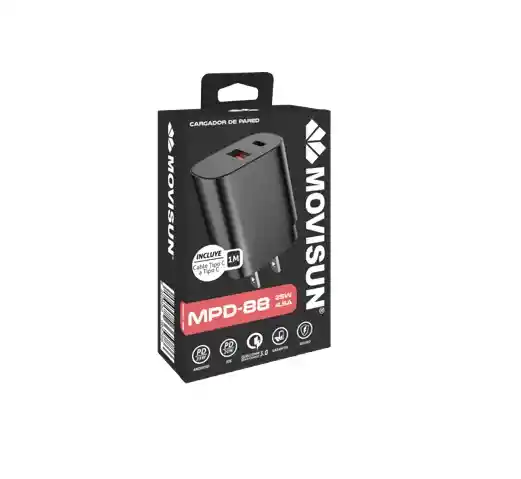 Cargador Movisun MPD-88 25W 4.5A Carga Turbo Qualcomm Potencia y velocidad sin límites. El Movisun MPD-88 destaca en el mercado por ofrecer una salida excepcional de 4.5 Amperios, garantizando una carga turbo extremadamente eficiente para tus dispositivos Android e iOS. Es el cargador ideal para quienes no pueden permitirse esperar. Características Destacadas: Potencia de 25W con 4.5A: Uno de los amperajes más altos en su categoría, lo que permite una transferencia de energía rápida y fluida. Tecnología Qualcomm Quick Charge 3.0: Optimiza los tiempos de carga mediante un protocolo de carga turbo inteligente. Compatibilidad Dual Optimizada: Android: Soporta carga PD 25W para un rendimiento máximo en dispositivos con este sistema. iOS: Compatible con carga de 20W, ideal para las series más recientes de iPhone. Diseño de Salida Dual: Equipado con 1 puerto USB y 1 puerto Tipo C, permitiendo la conexión de diversos periféricos. Seguridad y Confianza: Certificado con Calidad Original, incluye garantía y múltiples protecciones de seguridad para tu tranquilidad y la de tus equipos. ¿Qué incluye tu compra? 1 Adaptador de corriente Movisun MPD-88 25W. 1 Cable Tipo C a Tipo C de 1 metro de alta durabilidad. Empaque original de fábrica. Por qué el MPD-88 es tu mejor opción: Mientras que otros cargadores de 25W ofrecen amperajes estándar, el MPD-88 eleva la apuesta a 4.5A. Esto se traduce en una carga más estable y rápida para dispositivos de alto consumo, asegurando que tu batería se llene de manera óptima y segura.