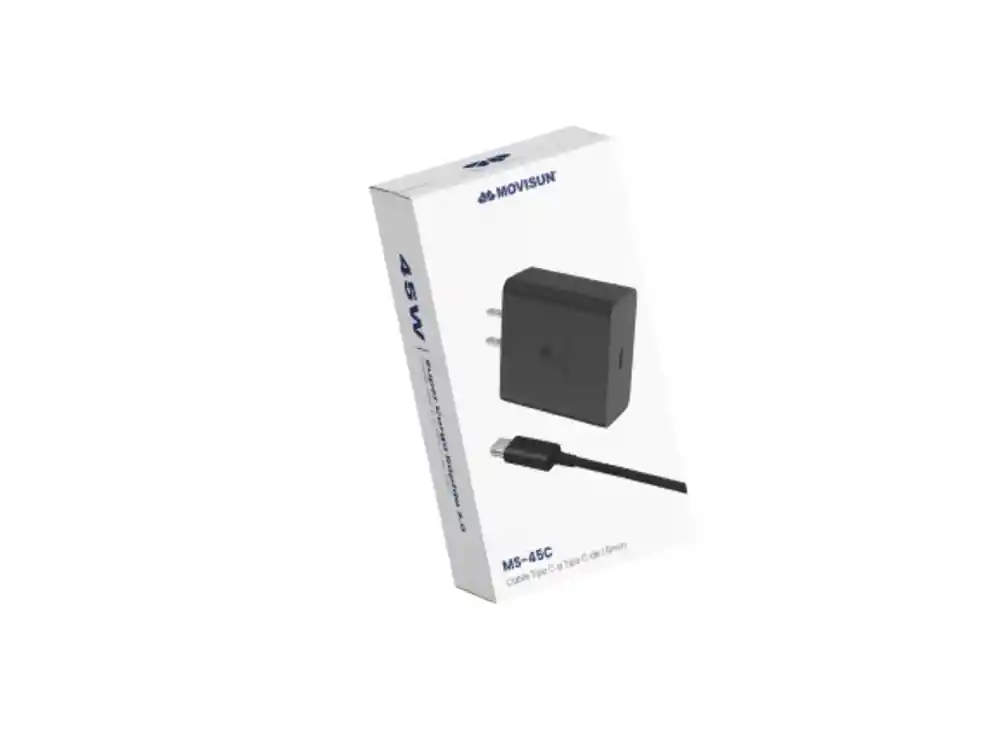 Cargador Movisun MS-45C 45W Carga Súper Rápida 2.0 Laptop iPhone Potencia y eficiencia en un diseño elegante. El Movisun MS-45C es un cargador de alto rendimiento con 45W de potencia real, diseñado para ofrecer una Súper Carga Rápida 2.0. Es el compañero perfecto para quienes necesitan cargar rápidamente desde smartphones de última generación hasta laptops compactas. Características Principales: Súper Carga Rápida 2.0: Tecnología optimizada para entregar energía a la máxima velocidad permitida por tus dispositivos. Potencia de 45W: Capacidad suficiente para alimentar dispositivos exigentes, incluyendo laptops con carga de 20V. Tecnología Power Delivery 3.0: Protocolo de carga inteligente que garantiza una compatibilidad amplia y una entrega de energía eficiente. Full Compatibilidad: Diseñado para funcionar perfectamente con dispositivos Apple (iPhone/iPad) y una amplia gama de equipos Android. Seguridad Superior (Material Ignífugo): Construido con componentes resistentes al fuego para proteger tu hogar y tus dispositivos. Calidad Original: Fabricado bajo estrictos estándares de calidad para asegurar la durabilidad del cargador y la salud de tu batería. ¿Qué incluye tu compra? 1 Adaptador de corriente Movisun MS-45C 45W. 1 Cable Tipo C a Tipo C de 1.5 metros. Empaque original de fábrica. Por qué elegir el MS-45C: A diferencia de los cargadores genéricos, el MS-45C ofrece una salida de 20V real para laptops y cuenta con certificación ignífuga, brindando una carga veloz sin comprometer la seguridad. Su cable de 1.5 metros incluido ofrece la longitud ideal para trabajar cómodamente mientras cargas.