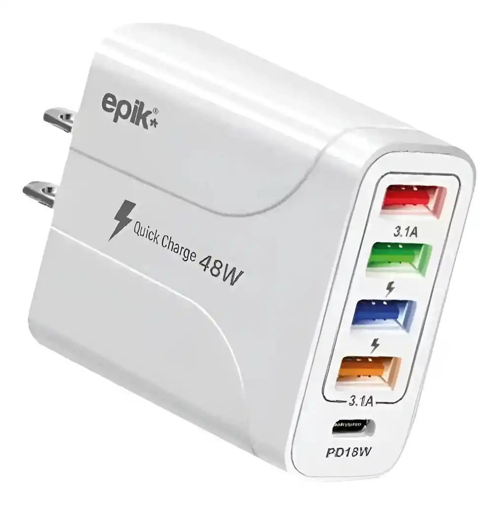 Cargador Pared Además de ofrecer una carga rápida y eficiente para tus dispositivos, este cargador de pared con puerto USB Tipo C te brinda la versatilidad necesaria para cargar dispositivos modernos que utilizan este tipo de conexión, asegurando que estés siempre conectado y listo para cualquier situación. DESCRIPCION ECK El Cargador de Pared con 4 Puertos USB y 1 Puerto USB Tipo C de 48W ofrece una solución conveniente y eficiente para cargar múltiples dispositivos simultáneamente. Con cuatro puertos USB estándar y un puerto USB Tipo C, este cargador te permite cargar smartphones, tabletas, cámaras y otros dispositivos electrónicos con rapidez y facilidad. Su capacidad de carga rápida de 48W garantiza una carga eficiente incluso para dispositivos de alta potencia. Además, su diseño compacto y portátil lo hace perfecto para viajes, trabajo o uso diario en el hogar u oficina. CARACTERISTICAS Cargador de pared con 4 puertos USB estándar y 1 puerto USB Tipo C. Capacidad de carga rápida de 48W para una carga eficiente. Compatible con una amplia gama de dispositivos electrónicos. Diseño compacto y portátil, ideal para viajes. Protección contra sobrecargas, sobretensiones y cortocircuitos para una carga segura. Indicadores LED que muestran el estado de carga. Tecnología de carga inteligente que proporciona la cantidad óptima de energía según el dispositivo. Construcción duradera y resistente para un uso prolongado. Compatible con estándares de seguridad internacionales. Garantía de calidad y satisfacción del cliente. Medidas: Alto: 5.5cm Ancho: 2.5cm Largo: 6cm Peso: 84g QUE INCLUYE LA COMPRA x1 Cargador Pared