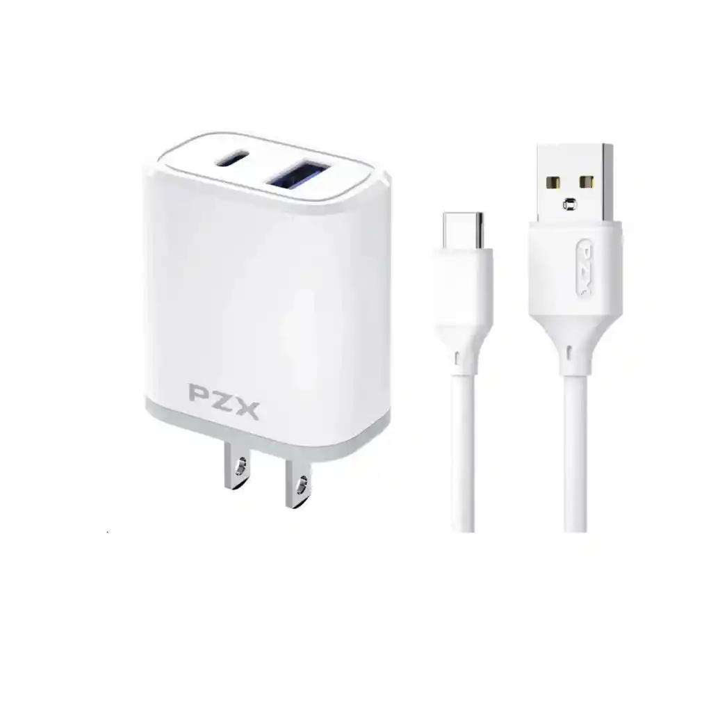 Cargador Celular PZX • Carga Rápida / Micro (V8) • Cabezal + Cable • Compatible con Android • Entrada: AC100-240V/ 0.3A • Salida USB: 2.4A MAX • Salida PD: 18W • Color: Blanco • Cable redondo • Regulador de energía