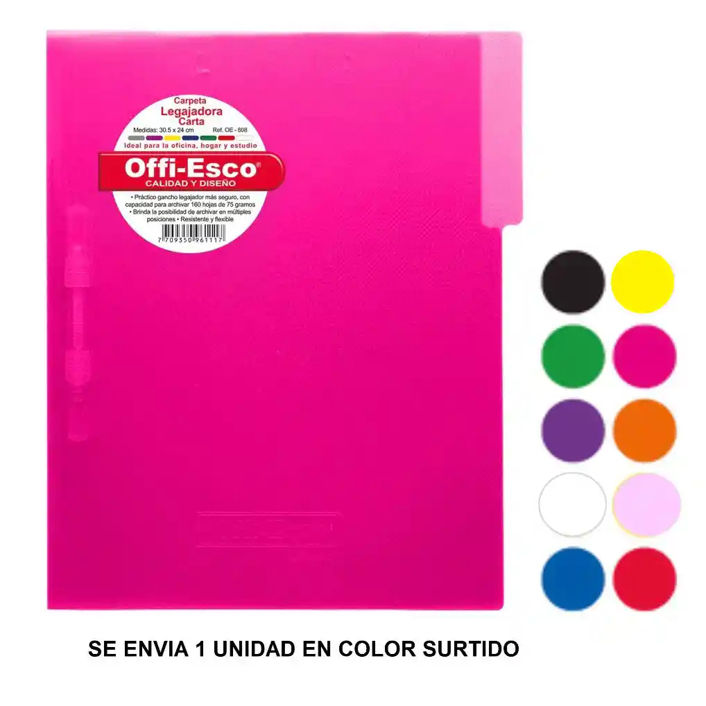 Práctico Carpeta con gancho legador más seguro con capacidad para archivar 160 hojas de 75 gramos. Brinda la posibilidad de archivar en múltiples posiciones. Resistente y flexible. Se envia color segun disponibilidad