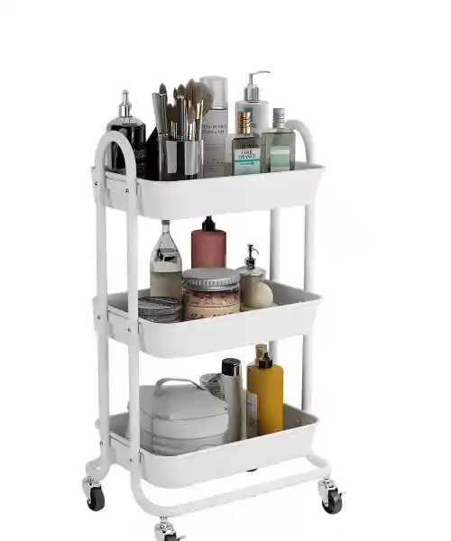 Carrito de utilidad de metal de 3 niveles, carrito multifuncional de servicio con ruedas bloqueables, fácil de montar, adecuado para oficina, baño, cocina, jardín Materiales:(metal y plástico y blanco)
