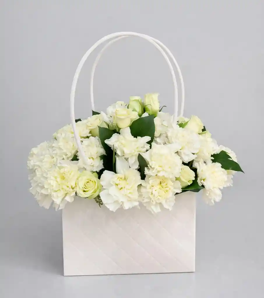 Cartera blanca de decorativa con delicado arreglo de flores blancas naturales. Su diseño elegante y minimalista transmite pureza, armonía y sofisticación.