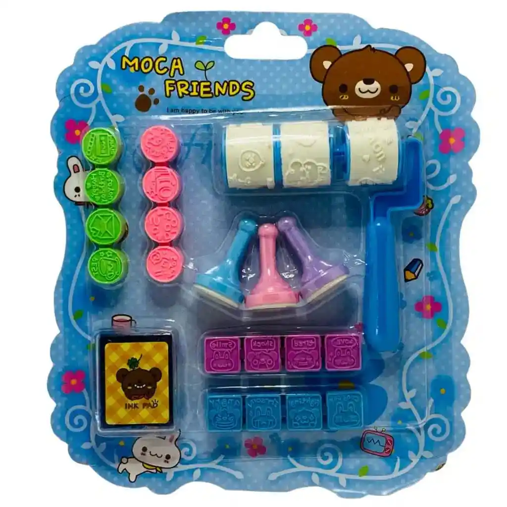 El set incluye sellos con diseños variados, un rodillo para sellar y una almohadilla de tinta. Los sellos son de alta calidad y durabilidad, ideales para decorar cuadernos, agendas, tarjetas y otros útiles escolares o de oficina. El diseño es bonito y divertido, con motivos como un oso y conejos.