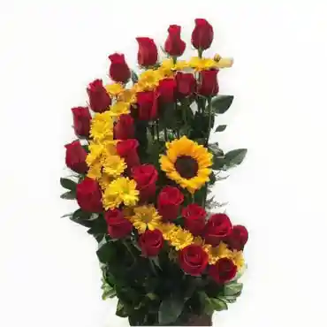 Caja de madera con 22 rosas rojas , 15 margaritas amarillas,un girasol y 2o varas de rusco La flor puede ser sustituida dependiendo la disponibilidad de color y del producto “Mensaje Personalizado” máximo de 30 caracteres (Dejar el mensaje en el chat, los comentarios no se previsualizan para la tienda por lo que si se dejan allí no podrá ser incluido)