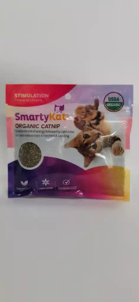 Hierba gatera orgánica certificada SMARTYKAT de 14 gramos seguramente hará que el tiempo de juego sea divertido para su amigo felino favorito. Involucrando a su gato en un juego más activo. nuestra hierba gatera es orgánica y se cultiva en nuestras propias granjas de hierba gatera.ASEGURANDO la frescura . esta mezcla de hierba gatera despertará a su mascota para que juegue.RELLENO de ingredientes puros y libre de productos químicos o pesticidas. Los gatos suelen desarrollar una reacción a la hierba gatera a los 9 meses de edad.