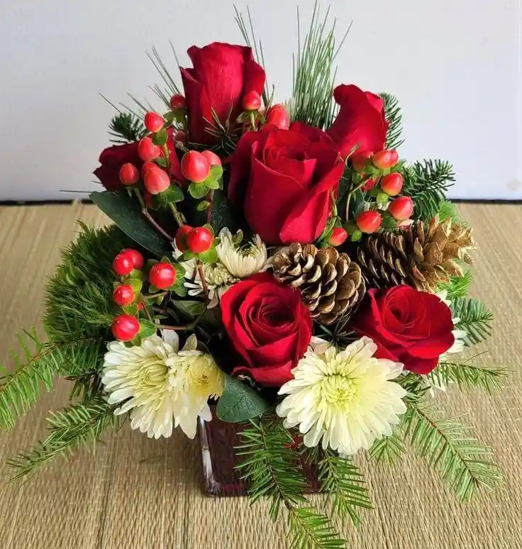 Un diseño navideño encantador y elegante. Este centro de mesa combina rosas rojas premium, flores blancas delicadas, follaje fresco tipo pino y detalles festivos como piñas doradas y bayas rojas, creando un arreglo cálido lleno de espíritu navideño. Perfecto para adornar mesas, regalar o ambientar espacios especiales. ✨ Características: • Rosas rojas premium • Flores blancas decorativas • Bayas rojas naturales • Piñas decorativas • Follaje verde tipo pino • Base cuadrada decorativa 🎁 Ideal para: Cena de Navidad, regalos corporativos, decoración de mesas, entradas y oficinas.