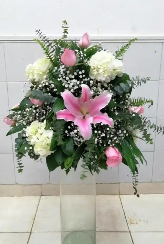 Arreglo con hortensias, rosas, margaritas, sombrillas, yipso y base de madera