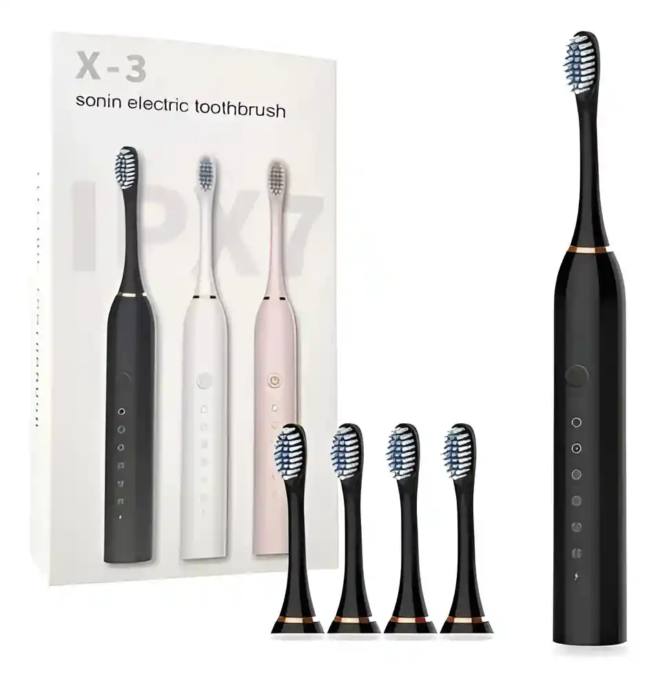 cepillo dental eléctrico sónico X-3 🪥⚡ Es un modelo recargable que normalmente viene con: ✔️ Tecnología sónica (vibraciones de alta frecuencia para limpieza profunda) ✔️ Varios modos de cepillado (limpieza, suave, blanqueamiento, masaje, etc.) ✔️ Temporizador inteligente de 2 minutos ✔️ Cabezal intercambiable ✔️ Batería recargable ✔️ Diseño moderno y elegante Este tipo de cepillo elimina más placa que uno manual y ayuda a mantener dientes más blancos y encías más saludables 🦷✨