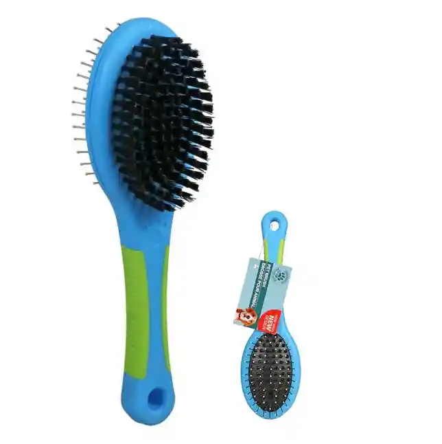 Cepillo doble uso para tu mascota, materiales resitentes y super esteticos, por un lado puedes usar las cerdas metalicas para desenrredar y por el otro terminar el proceso mediante cerdas suaves que quitaran el pelo mas fino.