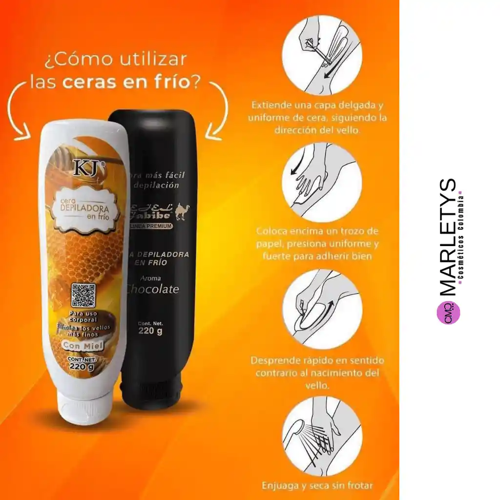 Cera Fria KJ - Chocolate La Cera Depiladora en Frío te ayudará a liberarte del vello no deseado, ahora elimina los vellos más finos en cualquier parte del cuerpo de forma rápida, eficaz y a la vez delicada con la piel. Esta innovadora y exclusiva fórmula lista para usarse contiene ingredientes naturales que aportan una suavidad incomparable a tu piel. No es necesario calentar, esperar o soportar productos irritantes. ¡Pruébala y sus resultados te van a encantar! Contiene miel de abeja. ¡Depílate en segundos! No irrita. Suaviza la piel. Extiende sobre la zona a depilar una capa delgada y uniforme de cera, siguiendo la dirección de crecimiento del vello, coloca un trozo de una hoja de papel sobre la capa de cera, presionando fuerte y uniformemente hasta que la superficie del papel quede totalmente adherida. No es necesario esperar, desprenda la tira de papel con un movimiento rápido y enérgico, hacia el sentido contrario del crecimiento del vello. Al término del depilado, enjuaga el área y seca sin frotar.