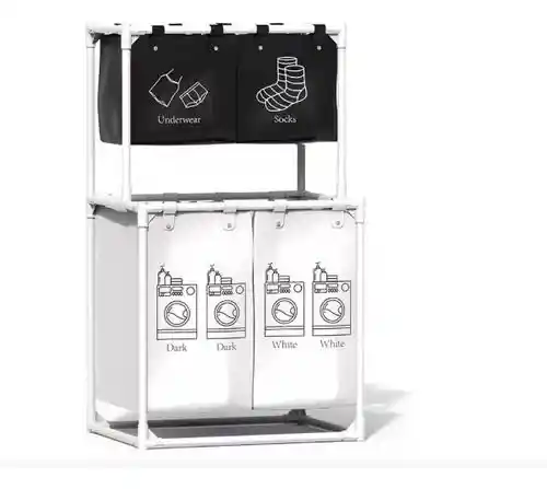 Cesta Clasificadora De Ropa Sucia De 2 Niveles, Cesta De Almacenamiento Para Ropa Sucia, Organizador De Ropa Sucia, Clasificador De Ropa Sucia Para Lavandería. Cesto con 4 compartimentos separados hacia arriba y hacia abajo, ofreciendo un amplio espacio de almacenamiento y maximizando la organización para diferentes tipos de lavandería o artículos del hogar. Cuenta con parte inferior elevada, manteniendo la cesta lejos de superficies húmedas o sucias del suelo, manteniendo la limpieza y preservando tus artículos. Diseñado con botones a presión, lo que hace que instalar y quitar la cesta sea muy fácil, asegurando la estabilidad durante el uso y facilitando el montaje sin complicaciones. Especificación: Color: Blanco + Negro Tejido: No Tejido Marco Material: Tubo De Fibra De Vidrio Talla:22.05 "L x 15.35" W x 37.4 "H / 56cm(L) X 39cm(W) X 95cm(H) Estilo: 4 Cestas Forma: Rectángulos Número de piezas: 1