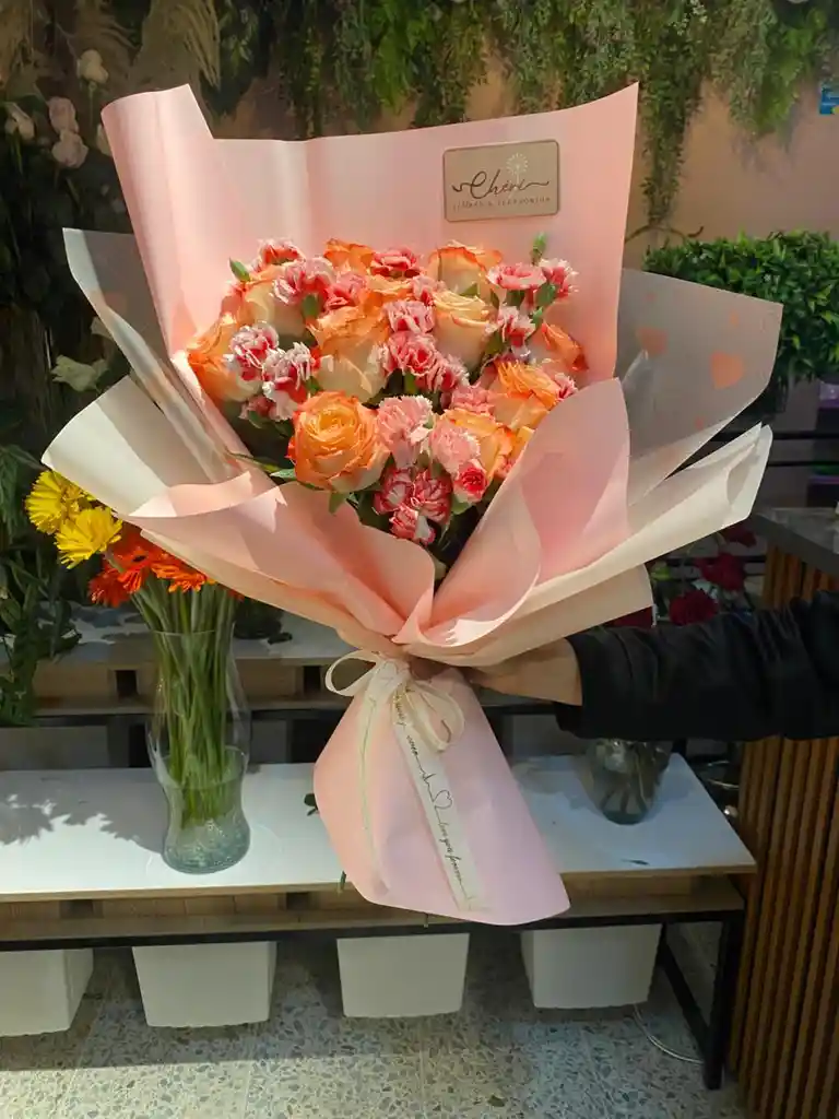 Bouquet de gran formato con una composición delicada en tonos durazno y rosados suaves, complementados con acentos verdes que aportan frescura y equilibrio. Su diseño compacto y voluminoso crea una presentación armoniosa, elegante y sutilmente romántica. Está envuelto en papel premium en tonos rosa y marfil, dispuesto en capas amplias que realzan su forma, y finalizado con un lazo fino que aporta un acabado refinado y sofisticado. Los bouquets pueden tener leves variaciones de flor, pero siempre manteniendo una armonía de tonos.