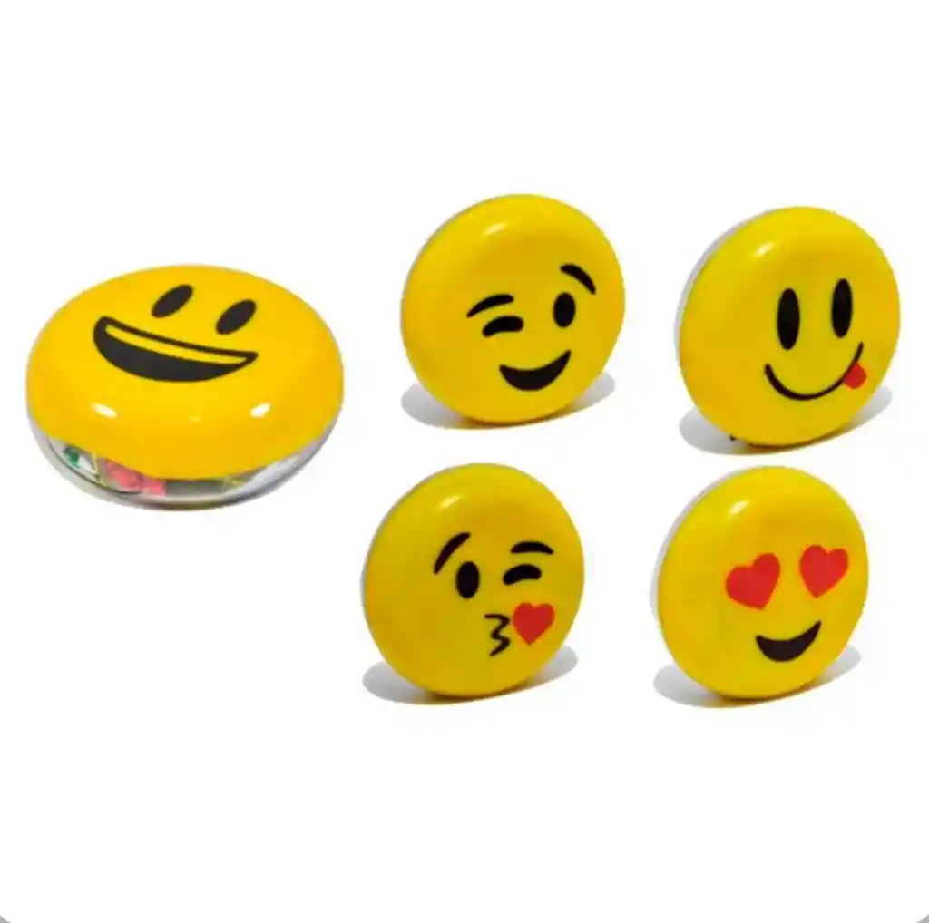 Este producto es un set de 5 chocolates individuales de la marca Adro, presentados en estuches circulares de color amarillo, con diseños tridimensionales que imitan a varios emojis populares, como la cara guiñando el ojo, la cara con lengua fuera, la cara lanzando un beso con corazón y la cara con ojos de corazón. Es importante notar que el diseño de los emojis está sujeto a disponibilidad y puede variar.