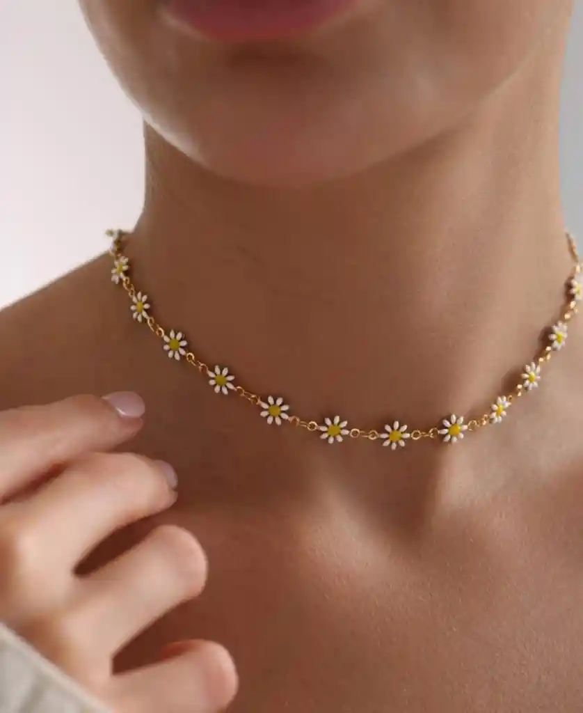 Choker delicado con flores tipo margarita, ligero y femenino. Se ajusta al cuello y aporta un toque fresco y sutil que realza cualquier look. Ideal para usar solo o en capas.
