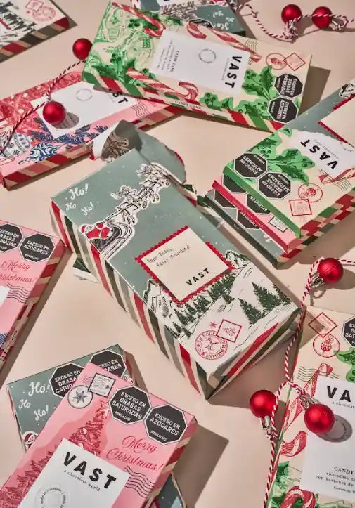 :) nuestras 3 barras de navidad empacadas en papel regalo . Candy Cane:chocolate de leche con bastones de menta Sea Salt: chocolate oscuro con sal marina Tea Cookies: chocolate blanco con té y galletas de navidad