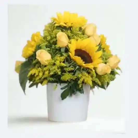 Cilindro de 6 girasoles , 12 rosas amarillas y 15 varas de solidago. La flor puede ser sustituida dependiendo la disponibilidad de color y del producto “Mensaje Personalizado” máximo de 30 caracteres (Dejar el mensaje en el chat, los comentarios no se previsualizan para la tienda por lo que si se dejan allí no podrá ser incluido)