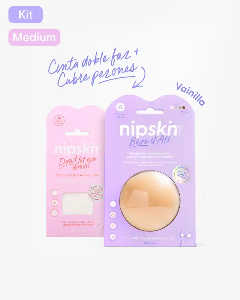 Cinta Doble Faz más Cubre pezón - Nipskin® Cubre pezones Medium circulares reutilizables, adhesivo e hipoalergénicos, hechos 100% de silicona de grado médico. NO contienen látex. Tienen un acabado matte, lo cual permite que el producto no refleje luz debajo de la ropa. Vienen en un tamaño de 8 cm para brindarte mayor cobertura e invisibilidad. Ideales para copas A-B. Color: Vainilla- Pieles claras subtono cálido, más amarillas. Don’t Let Me Down - Fashion Tape Cinta doble faz o doble cara, con adhesivo por ambos lados. Viene en paquete delgado, lista para usar en cualquier momento, y fácil de llevar contigo donde quiera que vayas sin necesidad de tijeras. Cantidad: 36 tiras pre-cortadas Tamaño de cada tira: 12 mm ancho x 8 cm de largo Color: Transparente Úsala en telas lisas y suaves como la seda para un funcionamiento adecuado. Si bien, el adhesivo está diseñado para funcionar en la mayoría de las telas, es posible que no sea tan efectivo en telas pesadas, con textura o que suelten pelusas, como el tejido de punto o el lino. La cinta es suave con las telas, sin embargo ten precaución al utilizarla en telas muy delicadas.
