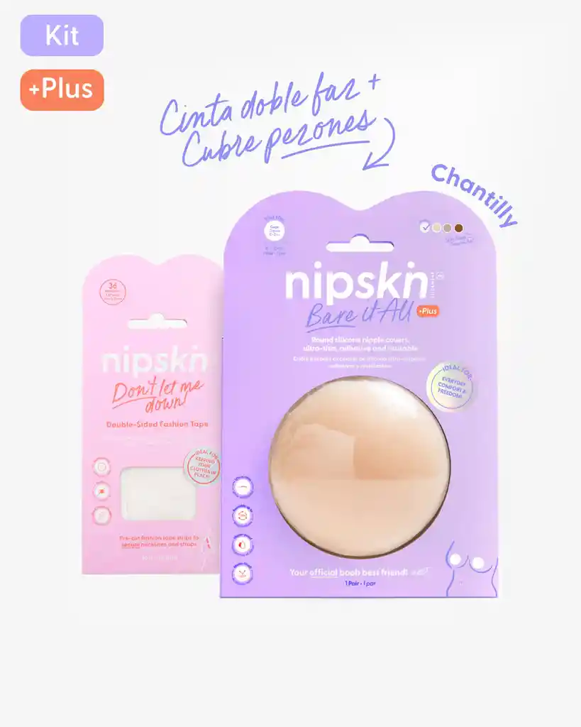 Cinta Doble Faz más Cubre pezón - Nipskin® Cubre pezones Medium circulares reutilizables, adhesivo e hipoalergénicos, hechos 100% de silicona de grado médico. NO contienen látex. Tienen un acabado matte, lo cual permite que el producto no refleje luz debajo de la ropa. Vienen en un tamaño de 10 cm para brindarte mayor cobertura e invisibilidad. Ideales para copas C-D. Color: Chantilly - Pieles muy claras subtono frío, más rosadas. Don’t Let Me Down - Fashion Tape Cinta doble faz o doble cara, con adhesivo por ambos lados. Viene en paquete delgado, lista para usar en cualquier momento, y fácil de llevar contigo donde quiera que vayas sin necesidad de tijeras. Cantidad: 36 tiras pre-cortadas Tamaño de cada tira: 12 mm ancho x 8 cm de largo Color: Transparente Úsala en telas lisas y suaves como la seda para un funcionamiento adecuado. Si bien, el adhesivo está diseñado para funcionar en la mayoría de las telas, es posible que no sea tan efectivo en telas pesadas, con textura o que suelten pelusas, como el tejido de punto o el lino. La cinta es suave con las telas, sin embargo ten precaución al utilizarla en telas muy delicadas.