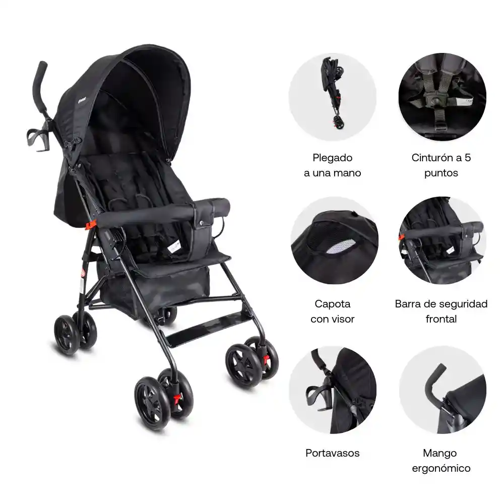 • Coche Paseador Robusto • Plegado Tipo Sombrilla • Liviano Y Compacto • Cinturón De Seguridad • Barra De Seguridad Frontal • Canopy Extensible • Canastilla Portaobjetos • Tela Melange • Espaldar Reclinable Hasta 170°