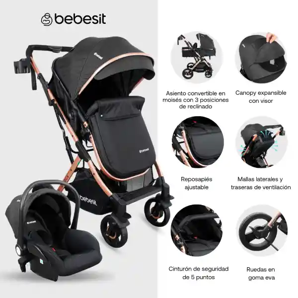 • Travel system tipo moíses con 3 posiciones de reclinado • Asiento tipo cuna • Mallas laterales y traseras de ventilación • Asiento reversible • Estructura liviana • Plegado compacto con cinta de viaje • Ruedas en goma eva • Reposapiés ajustable • Canopy extensible • Cobertor de pies • Canasta portaobjetos • Cinturon de seguridad de 5 puntos • Con silla portabebe grupo 0 • Medidas del coche: Alto 100cm, Largo 70cm, Ancho 62cm • Medidas del portabebé: Alto 56cm, Largo 68cm, Ancho 45cm